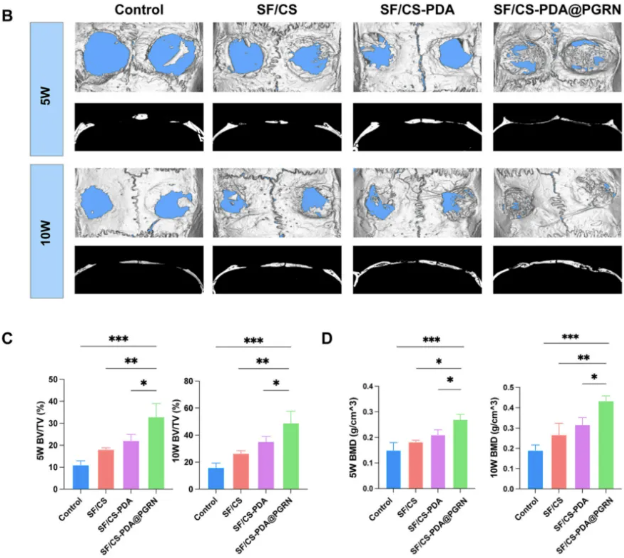 图5. 在大鼠颅骨缺损模型中使用不同支架的骨再生的体内评价。(B)每组术后5周和10周时颅骨缺损的代表性3D重建和二值化显微CT图像(对照、SF/CS、SF/CSPDA、SF/CS-PDA@PGRN)。(C-D)每个治疗组在5周和10周时BV/TV和BMD的定量评估(n = 3)。